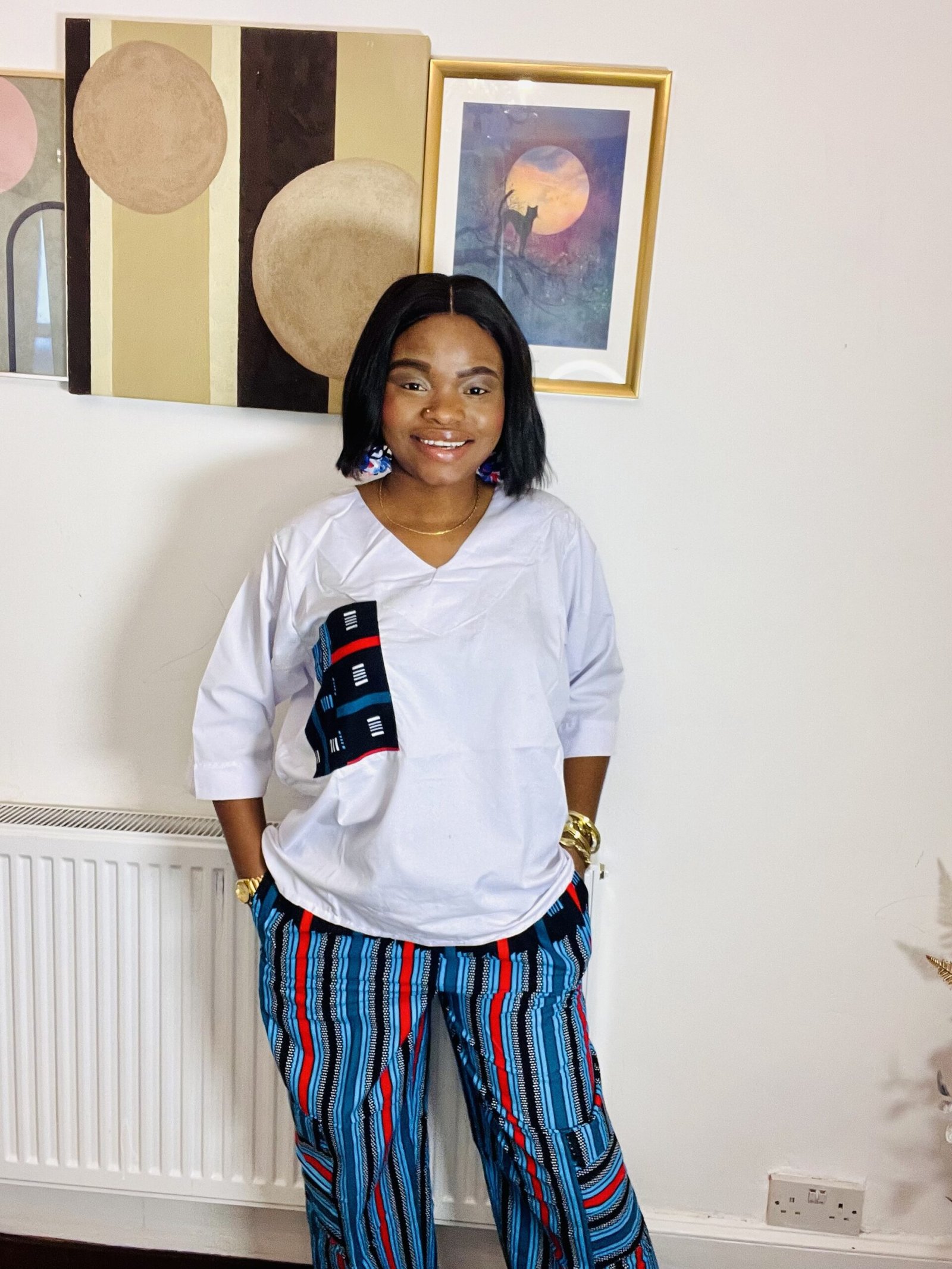 This two-piece set features a soft, relaxed-fit V-neck top in a clean neutral tone, beautifully accented with a bold African print patch pocket detail for a subtle statement. The matching high-waisted wide-leg trousers showcase vibrant vertical stripe patterns in rich shades of blue, red, and black, creating a flattering elongated silhouette.