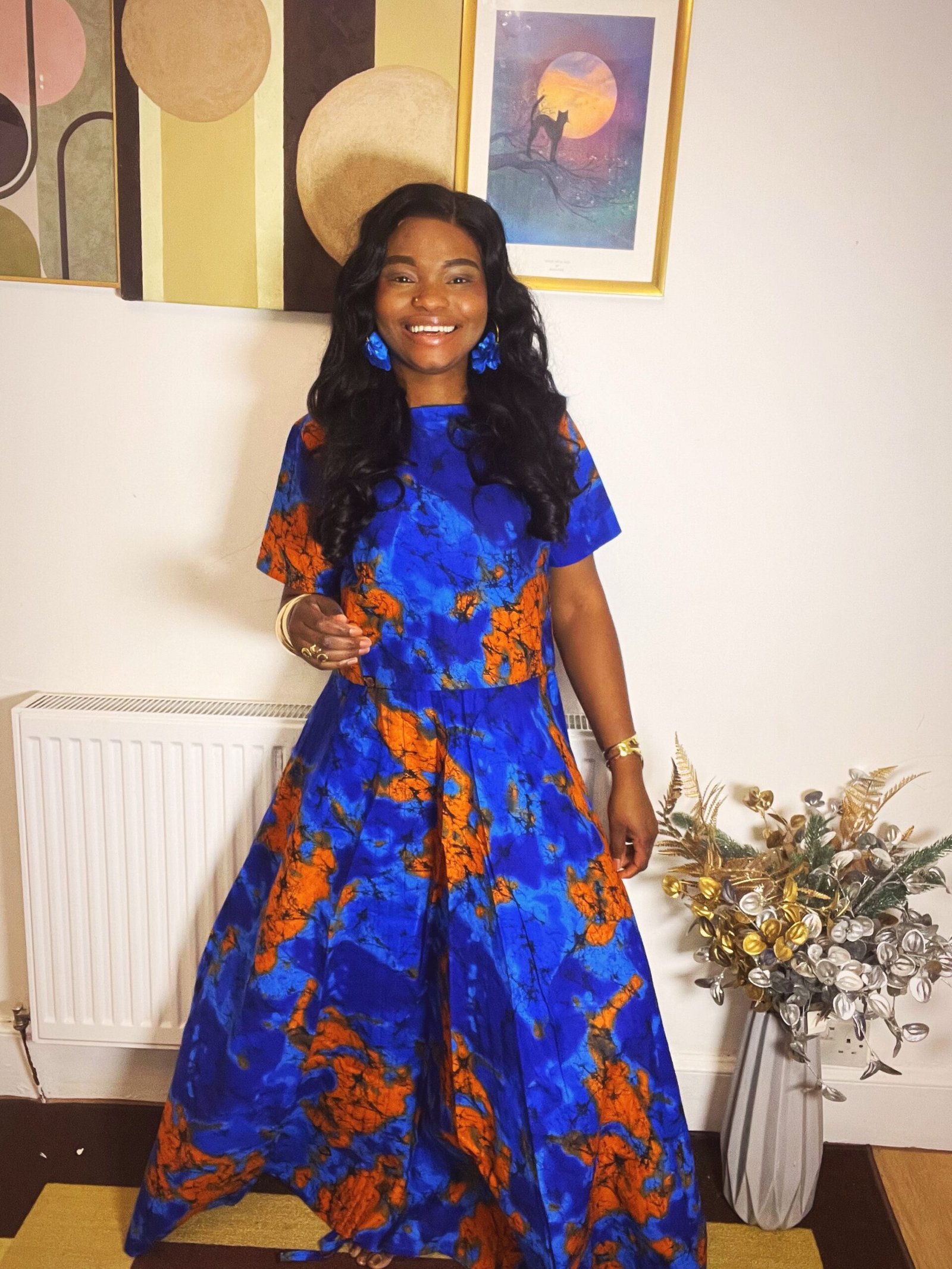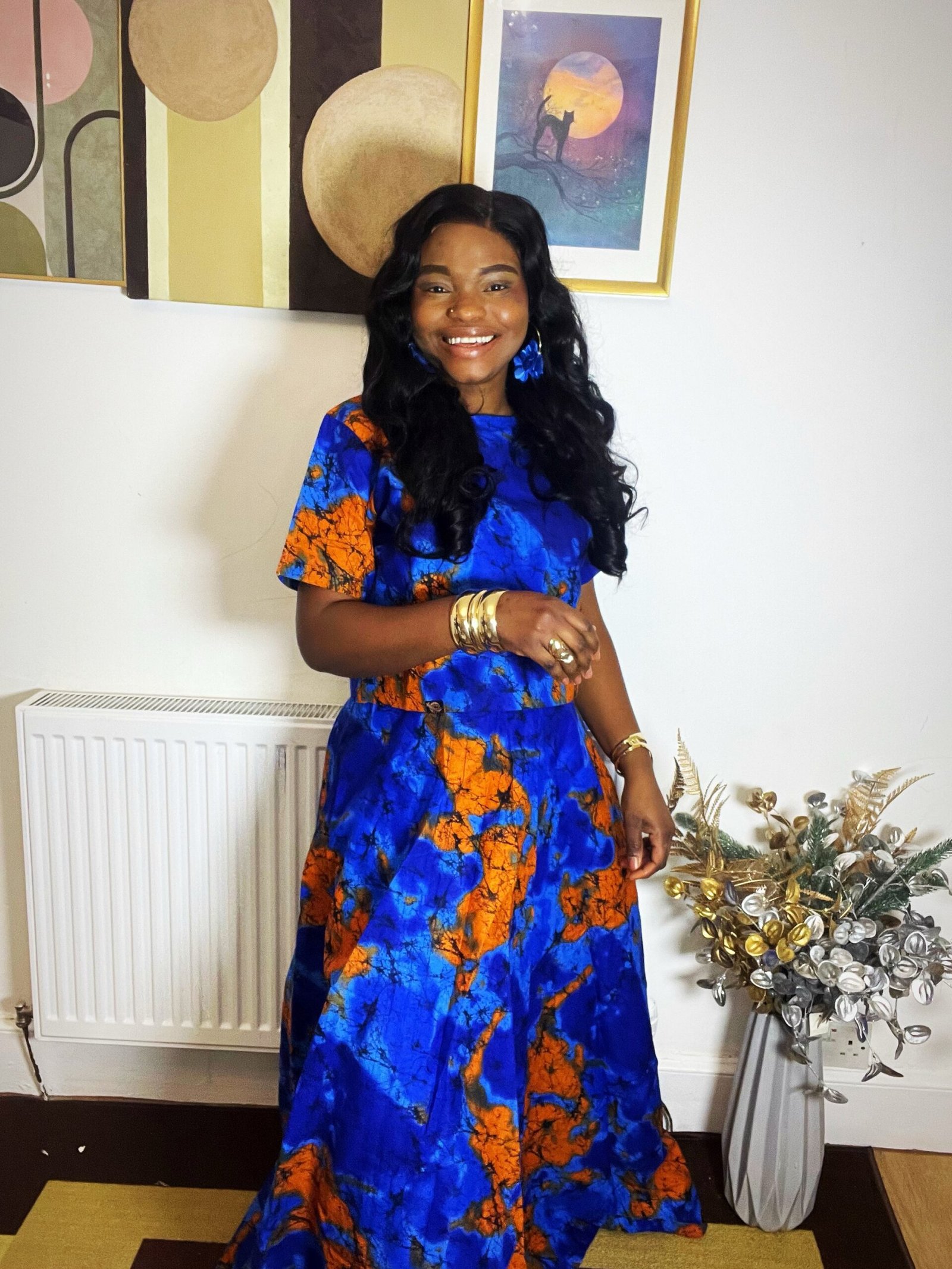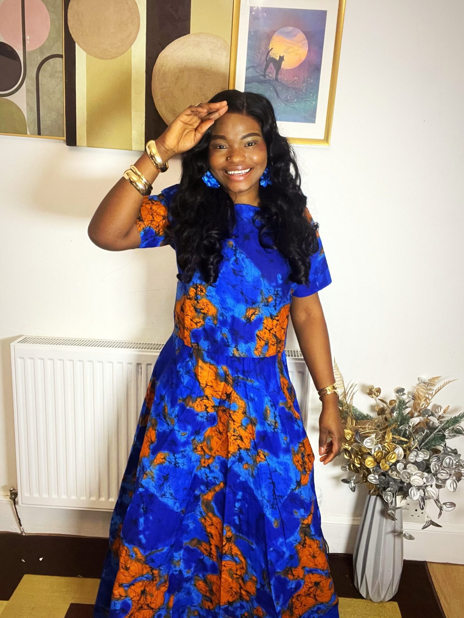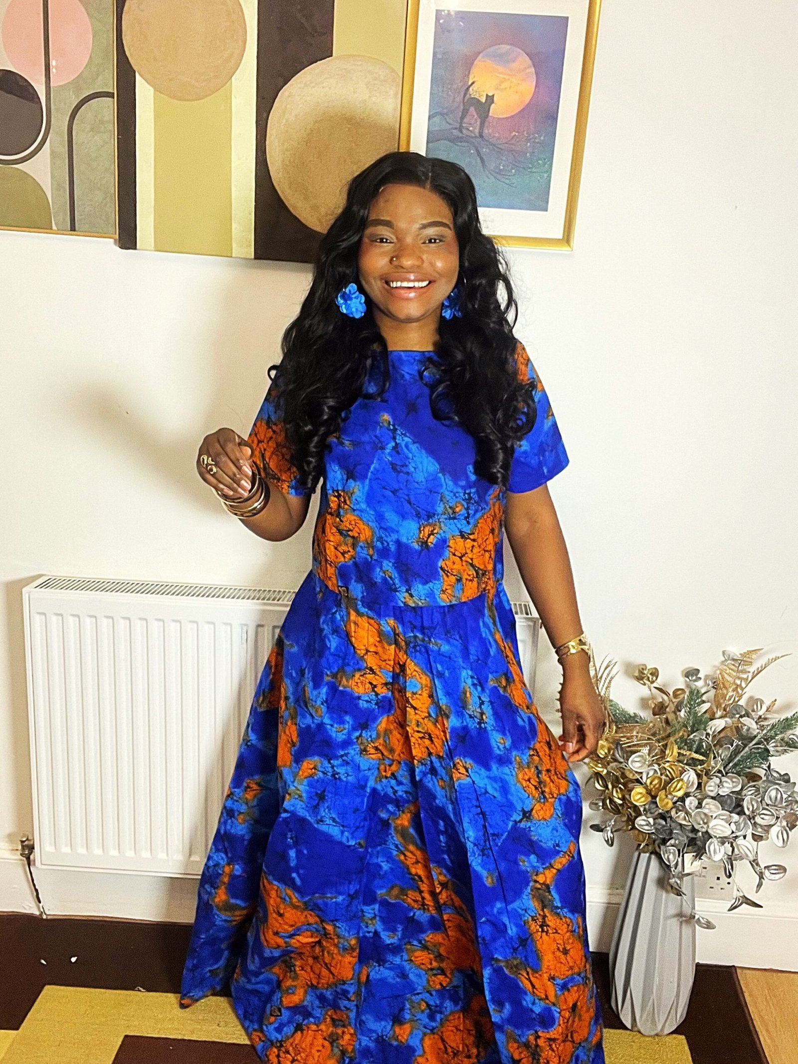 Designed in a rich royal blue base with striking orange abstract patterns, this dress celebrates confidence and individuality. The structured bodice flows into a soft, flattering silhouette that moves beautifully with every step.