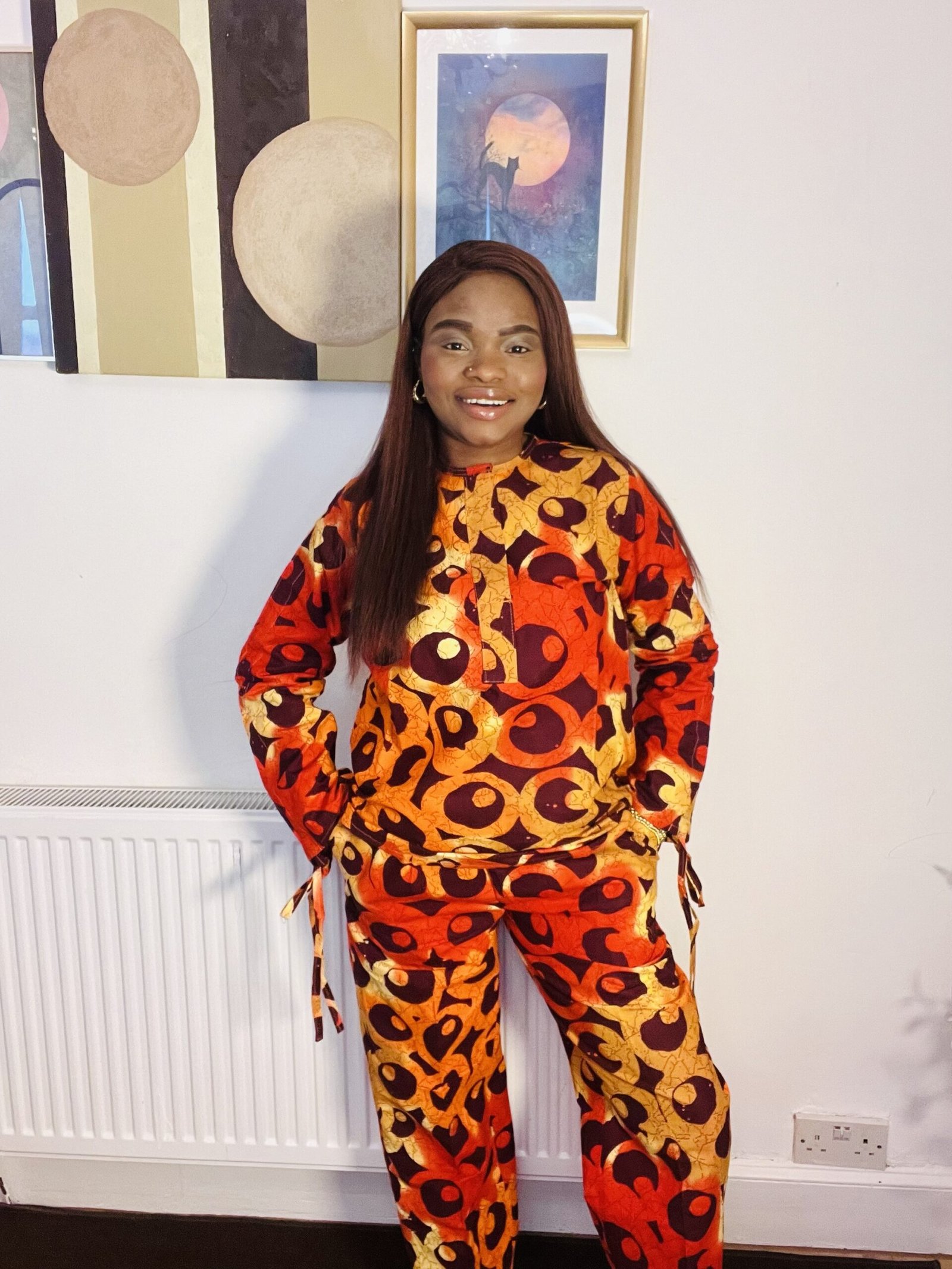 The bold circular pattern and warm fiery tones make this outfit perfect for women who love powerful prints and timeless African fashion.